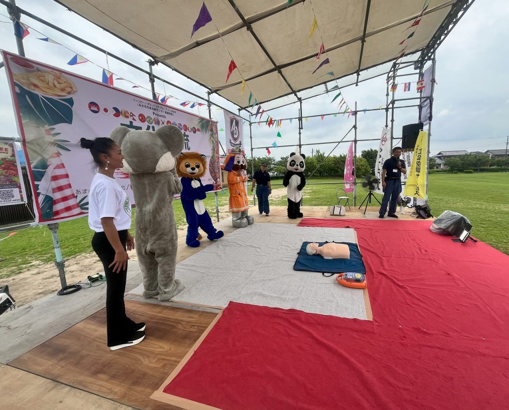 本校生徒たちは、着ぐるみを着てステージで外国人の皆さんと一緒にダンスを踊ったり、あま市消防本部の方々と一緒にAEDの実演を行ったりと地域活動に貢献できたことを喜んでいました。ESS部では今後も英語力を活かして地域の皆さんとの交流活動に力を入れていきたいと考えています。